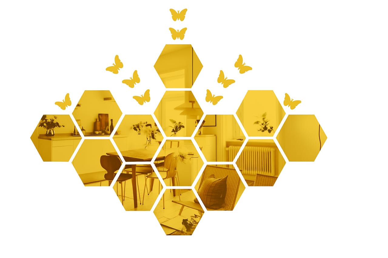 This is a wall décor mirror set made up of multiple hexagonal-shaped mirror tiles arranged in a honeycomb pattern. The design allows flexibility since each hexagon is an individual piece—you can place them in different patterns depending on the wall space and desired look.