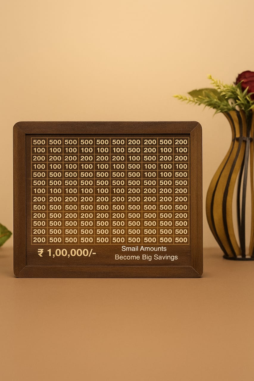 Turn small contributions into big savings with this beautifully crafted wooden savings challenge board. Each slot is marked with amounts ranging from ₹100 to ₹500, helping you track your progress towards a ₹1,00,000 goal. A fun, visual, and motivating way to build your savings habit while adding a stylish touch to your space.
